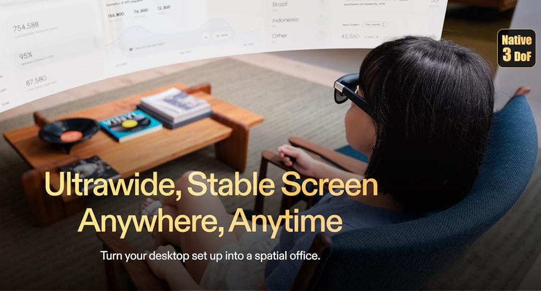 This Smart AR Glasseslooks almost identical to the XReal One, and can easily be mistaken for a slightly chunky pair of black sunglasses. A thin, glossy black front frame holds two smoke-tinted outward-facing lenses that can lighten or dim depending on whether you need to keep an eye on the real world around you or you want more isolation and higher contrast while viewing media. The lens-dimming feature carries over from the One , and is a nice perk that means you don’t have to deal with a snap-on sunshade or be committed to clear or dark lenses at all times.